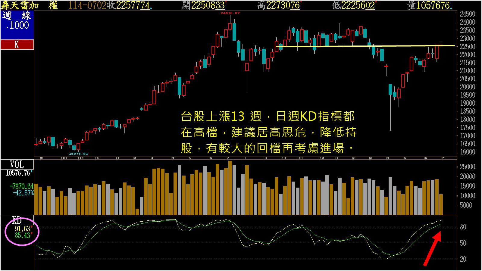 台股自17306點上漲以來,上漲5423點,週K線上漲第13週,面臨重要轉折的時間波,週KD指標來到91.6的高檔區,雖然多頭上升趨勢沒有改變,但漲勢明顯趨緩,短線的日KD指標也來到82.8的高檔位置,在日週KD指標都在高檔位置,指數來到22500點至23000點的密集套牢區,還是建議居高思危,降低持股,有較大的回檔再考慮進場。